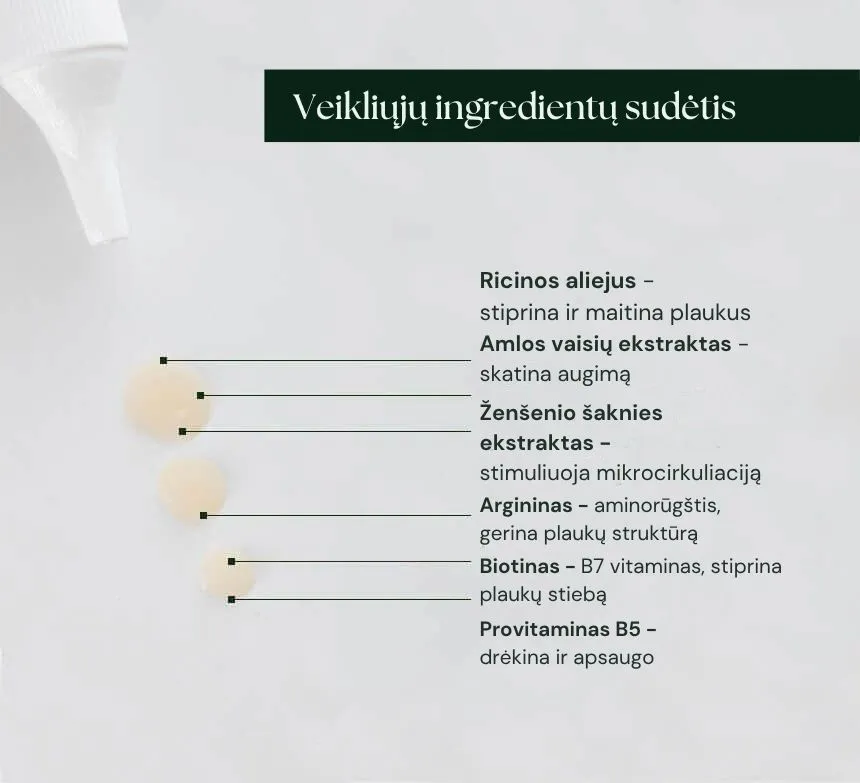 Serumas praturtintas aktyviųjų medžiagų kompleksu: ricinos aliejumi (gausus mononesočiųjų riebalų rūgščių, kurios stiprina, maitina plaukus, skatina augti), argininas (aminorūgštis, kuri gali pagerinti folikulo kraujotaką, plauko struktūrą, drėgmę), pantenoliu (plauko stiebui suteikia drėgmės, elastingumo), biotinu (B gr. vitaminas, žinomas dėl savo gebėjimo pagerinti plauko keratino struktūrą), amlos vaisiaus (turi daug vitamino C, antioksidantų ir būtinių maistinių medžiagų, kurios padeda skatinti plaukų augimą ir stiprinti plaukų struktūrą) ir ženšenio ekstraktais (gerina folikulų kraujotaką, stimuliuoja augimą), padeda plaukams augti greičiau ir užaugti ilgesniems.