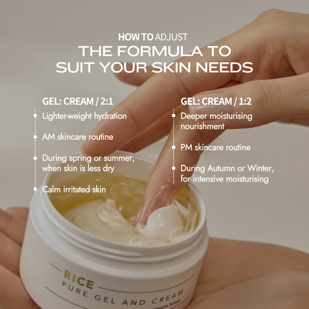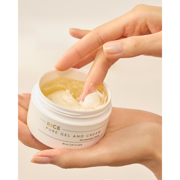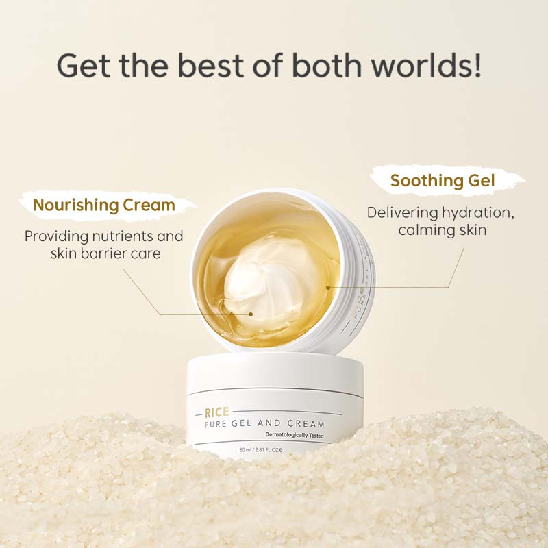 Unikalus korėjietiškas „Rice Pure Gel and Cream” yra dvifazis raminantis, drėkinantis 2in1 veido kremas, kuris jungia lengvą gelinę tekstūrą ir turtingesnę kreminę dalį, leidžiančią pritaikyti drėkinimą pagal odos poreikius.